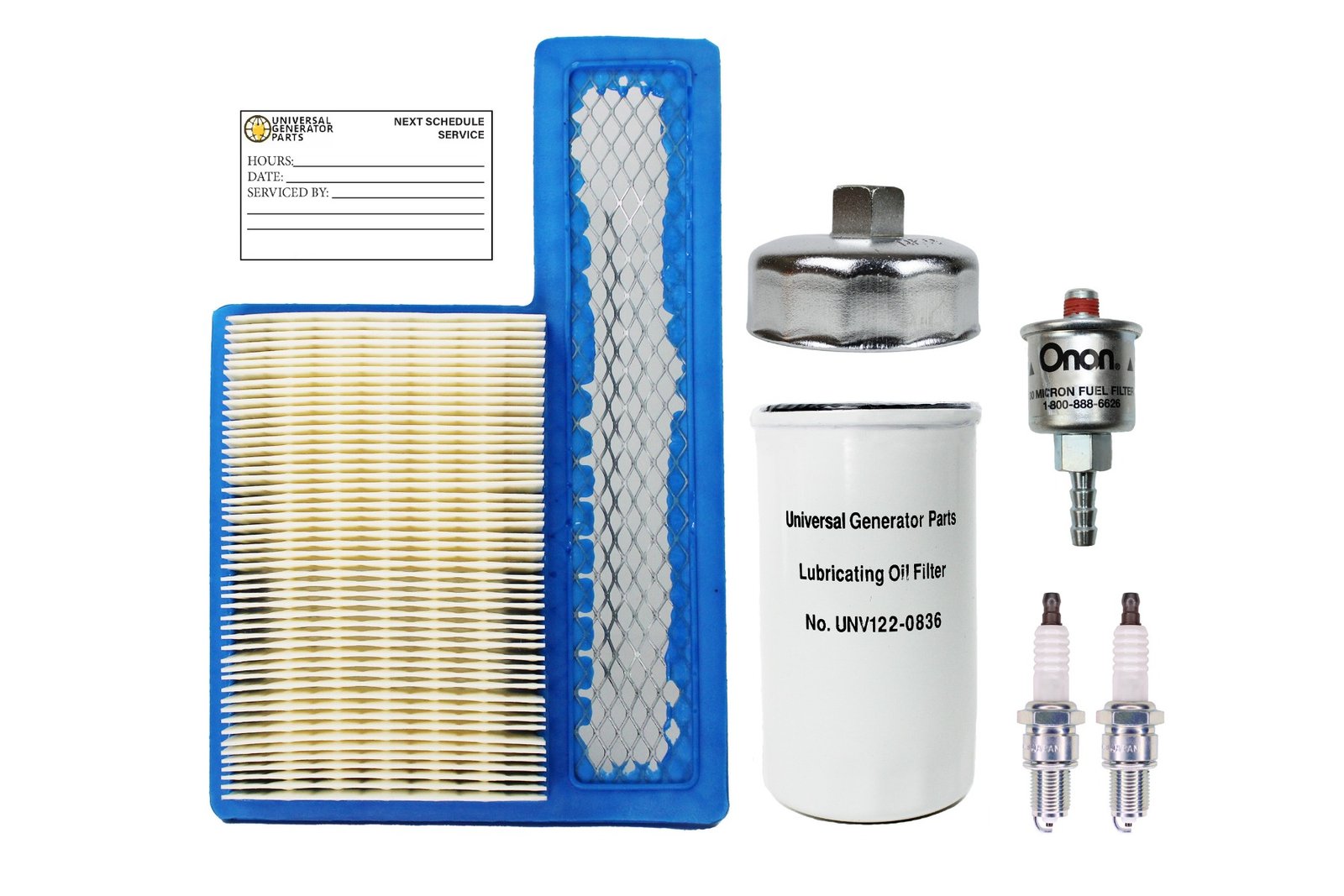 Universal Generator Parts Replacement for Onan RV Generators 5500 and 7000, HGJAA, HGJAB, and HGJAC Maintenance Kit. Includes Replacements for: 0140-3116 Air Filter, 122-0836 Oil Filter, 0149-2341 Fuel Filter, 2 BP4EY Spark Plugs, and 1 Oil Wrench