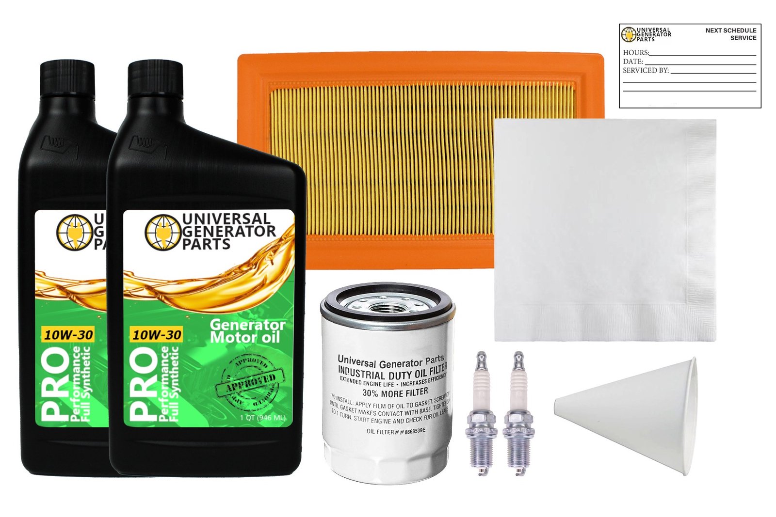• GENERATOR REPLACEMENT PARTS: This Universal Generator Parts Maintenance kit ensures smooth operation, extending the life of your engine with reliability. The Kit includes Full Synthetic 10W30 Engine Oil, an oil filter, air filter, spark plugs, paper funnel, oil wipe, and a reminder sticker.