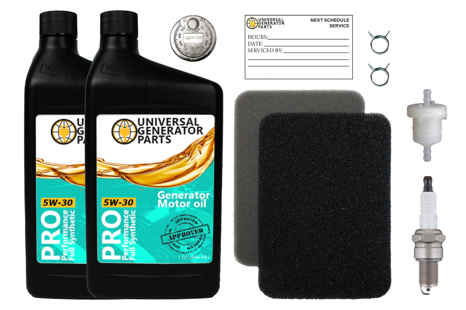 Essential maintenance items included: 2 qt. full synthetic 5W-30 motor oil, 1 UGP-0G84420151 air filter, 1 UGP-0G9914 fuel filter, 1 UGP-0J00620106 spark plug, 1 spark plug gap tool, 2 hose clamps, 1 oil funnel, and 1 Chamois, covering the key aspects of generator maintenance.