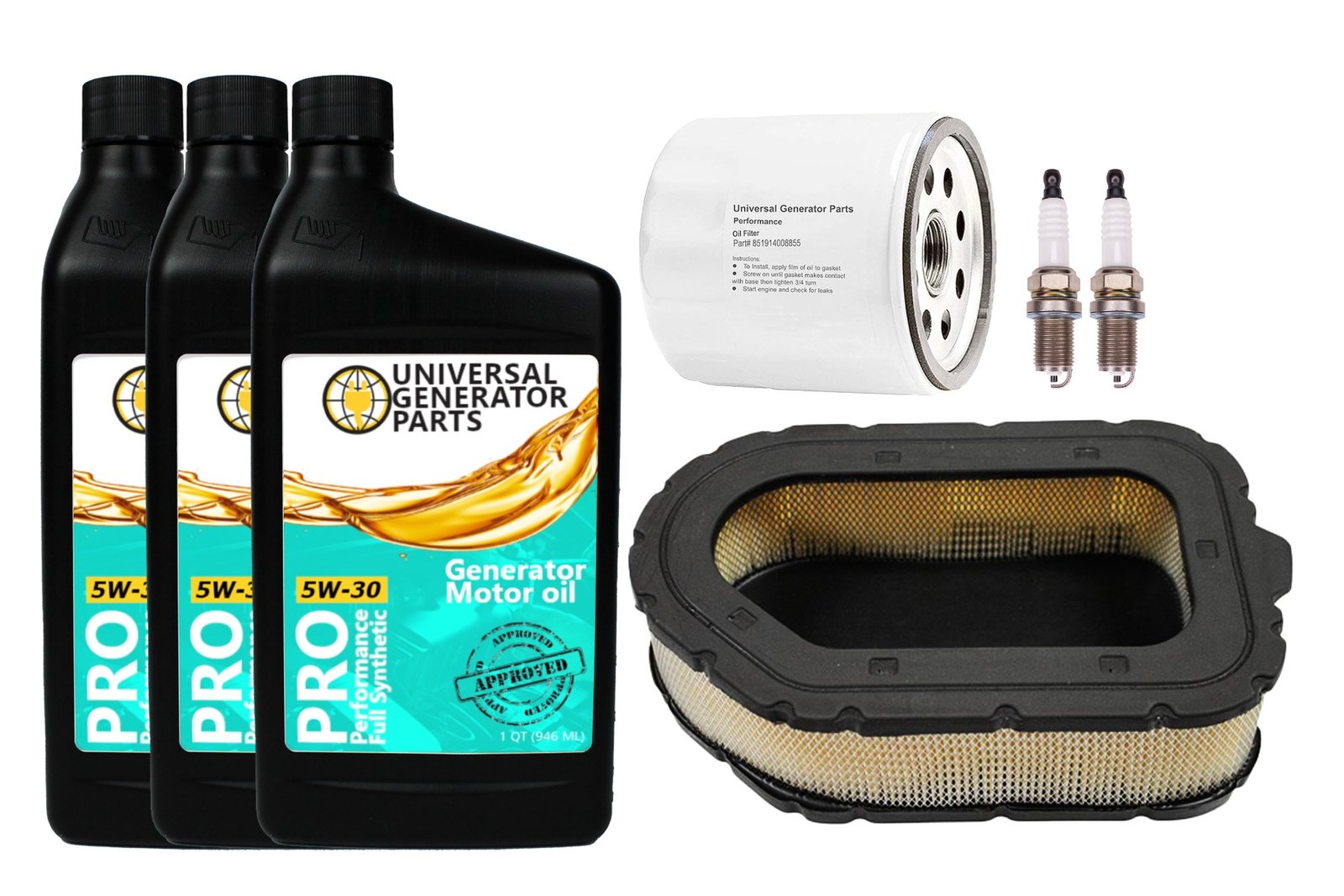 • The kit includes one air filter, one Pro Performance oil filter, three 1-quart bottles of synthetic engine oil, and two spark plugs.