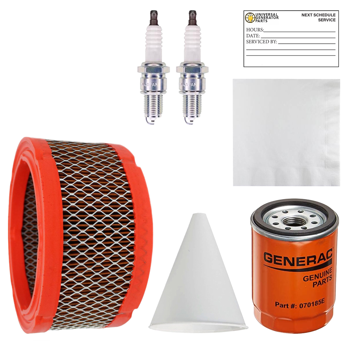 • ESSENTIAL REPLACEMENT KIT: This replacement engine kit includes a UGP air filter, oil filter, oil wipe, funnel paper, (2) spark plugs, and a reminder sticker. These high-quality components are essential for proper service, offering easy installation and ensuring your equipment performs.