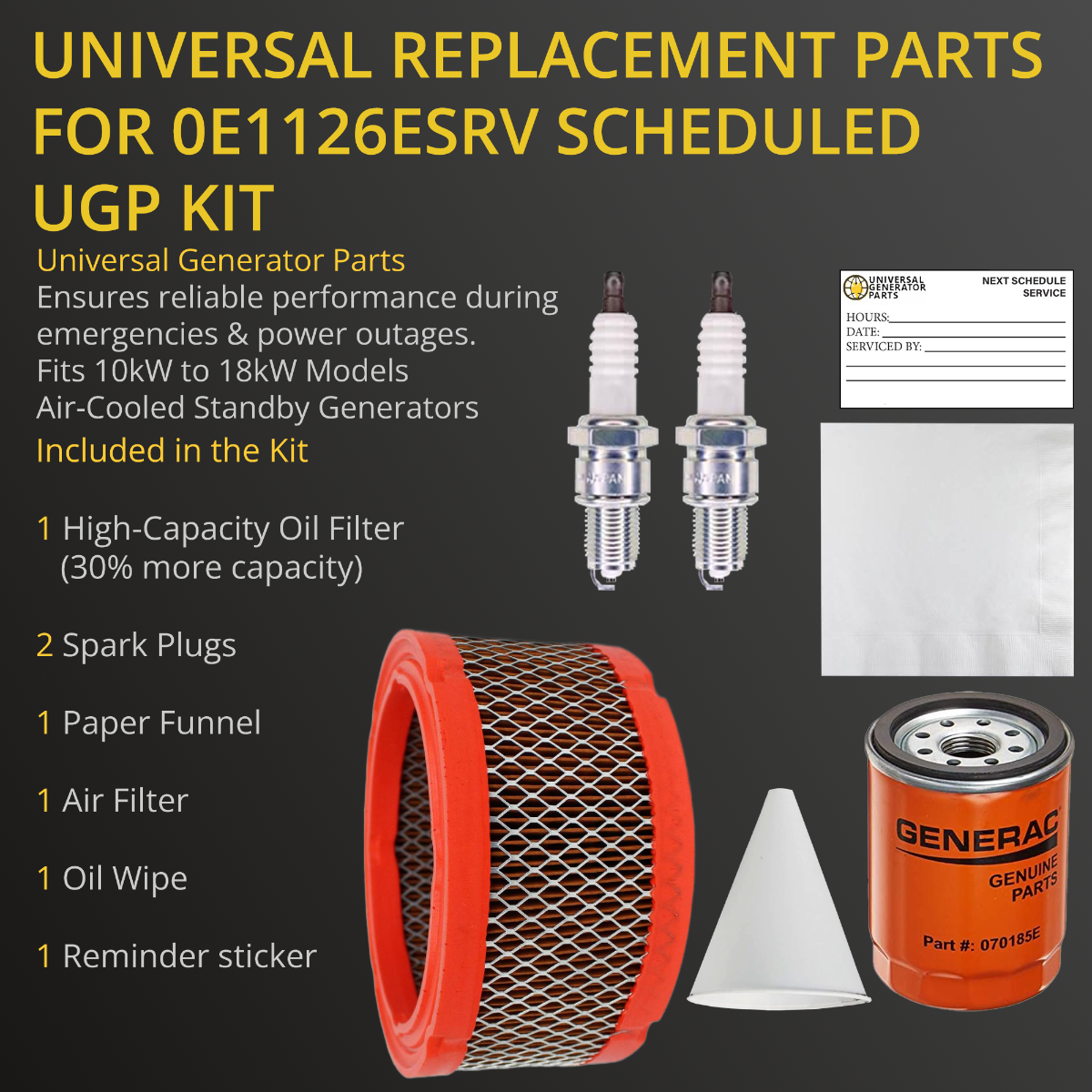 • AIR-COOLED STANDBY GENERATORS: The UPG Replacement Kit is designed for air-cooled standby generators with OHVI engines (760/990cc). It ensures proper maintain, enhancing the engine’s performance, longevity, and efficiency, ensuring your generator runs at peak performance.