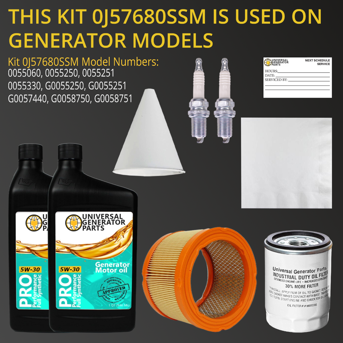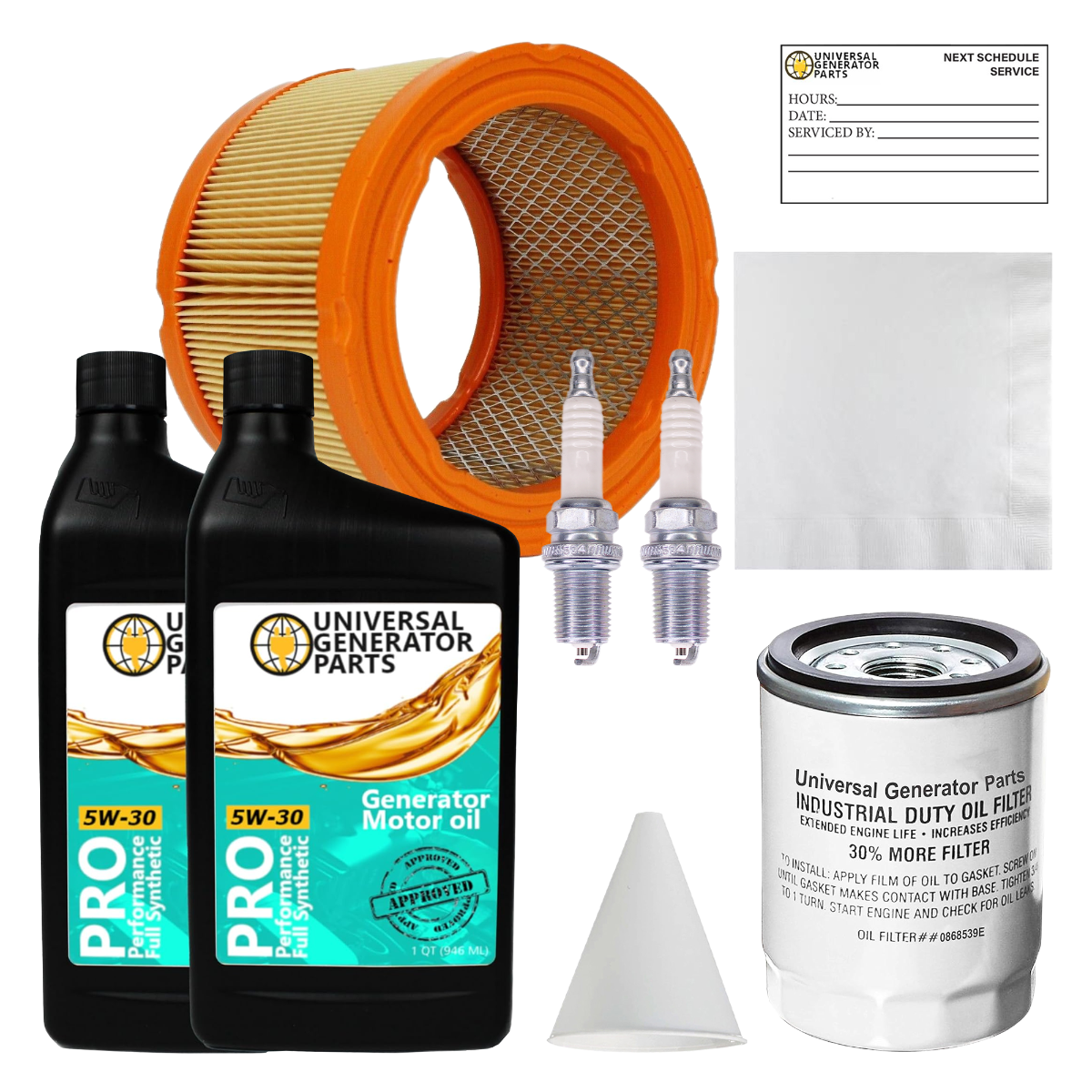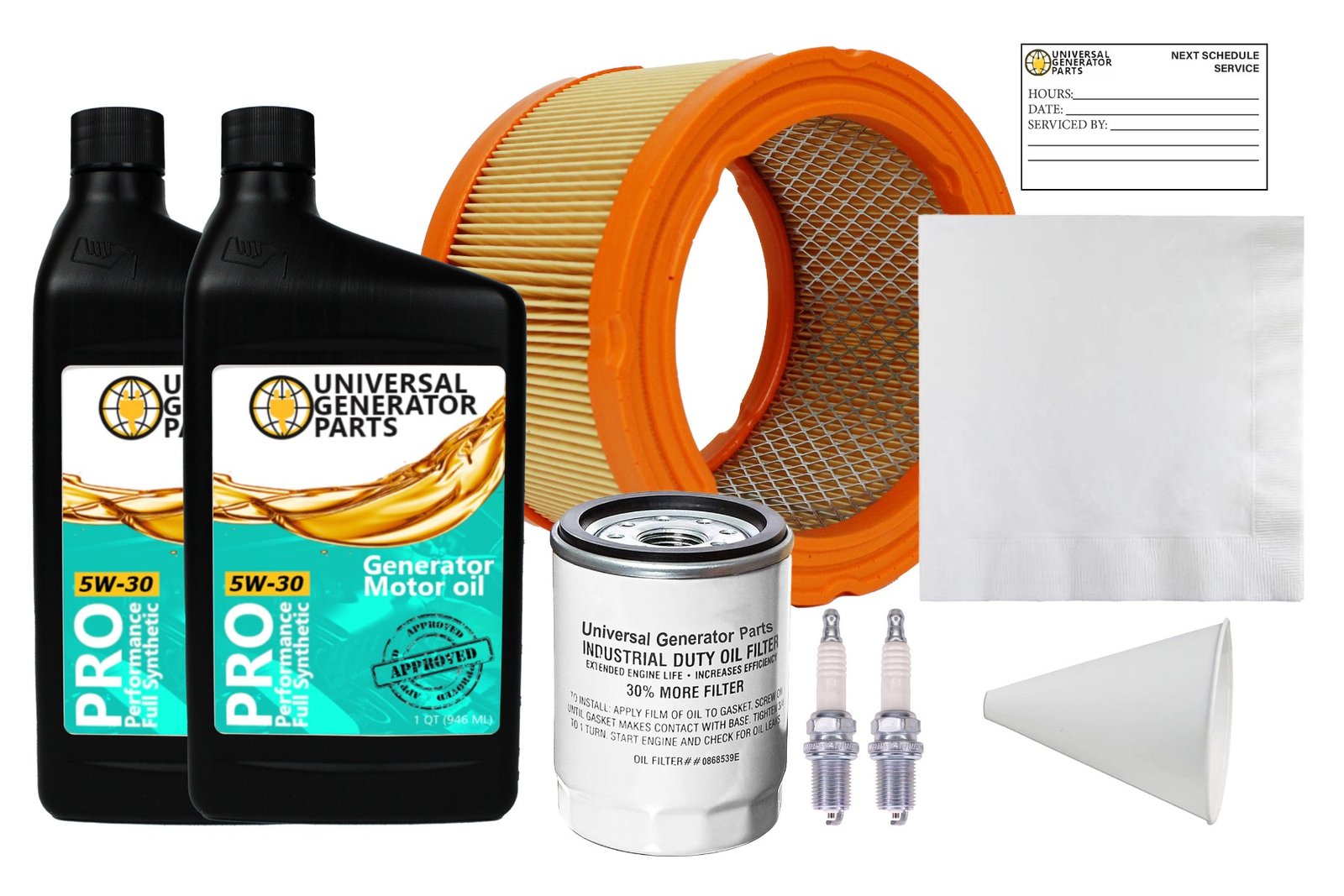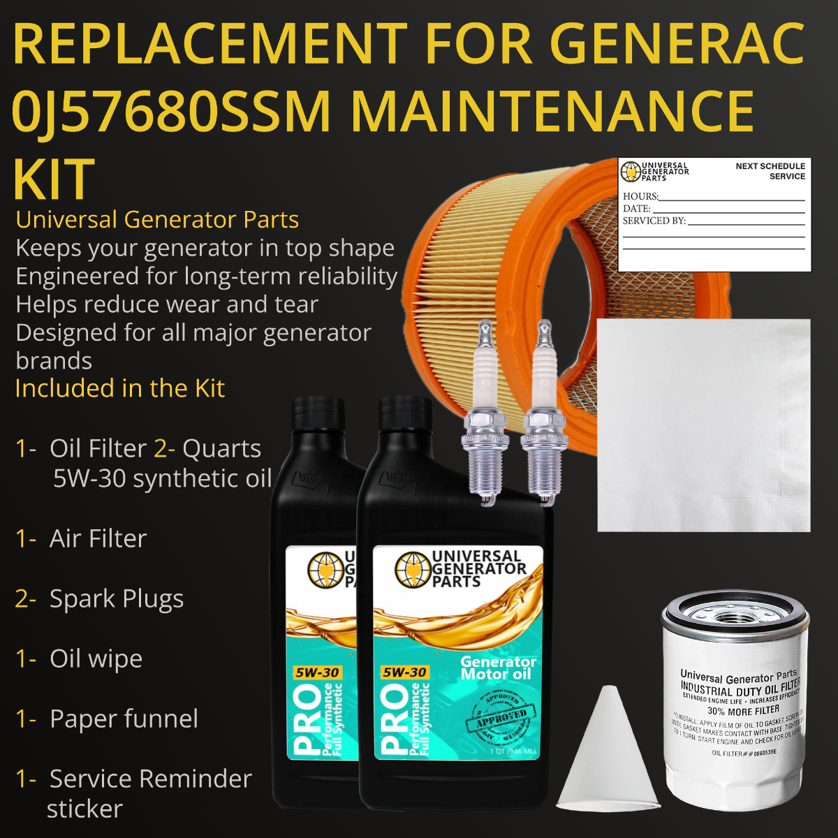 • UGP REPLACEMENT PARTS: This replacement kit includes (2) Quarts of synthetic motor oil, air filter, oil filter, (2) spark plugs, oil wipe, paper funnel, and a reminder sticker. This generator replacement part ensures optimal performance without compatibility issues.