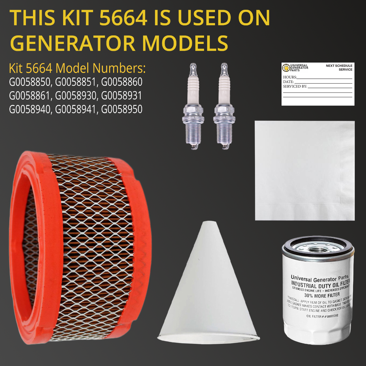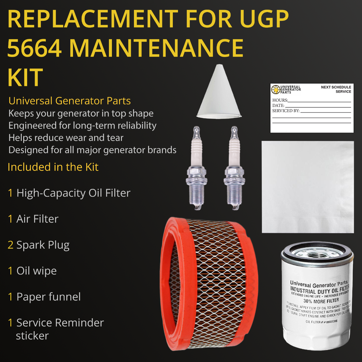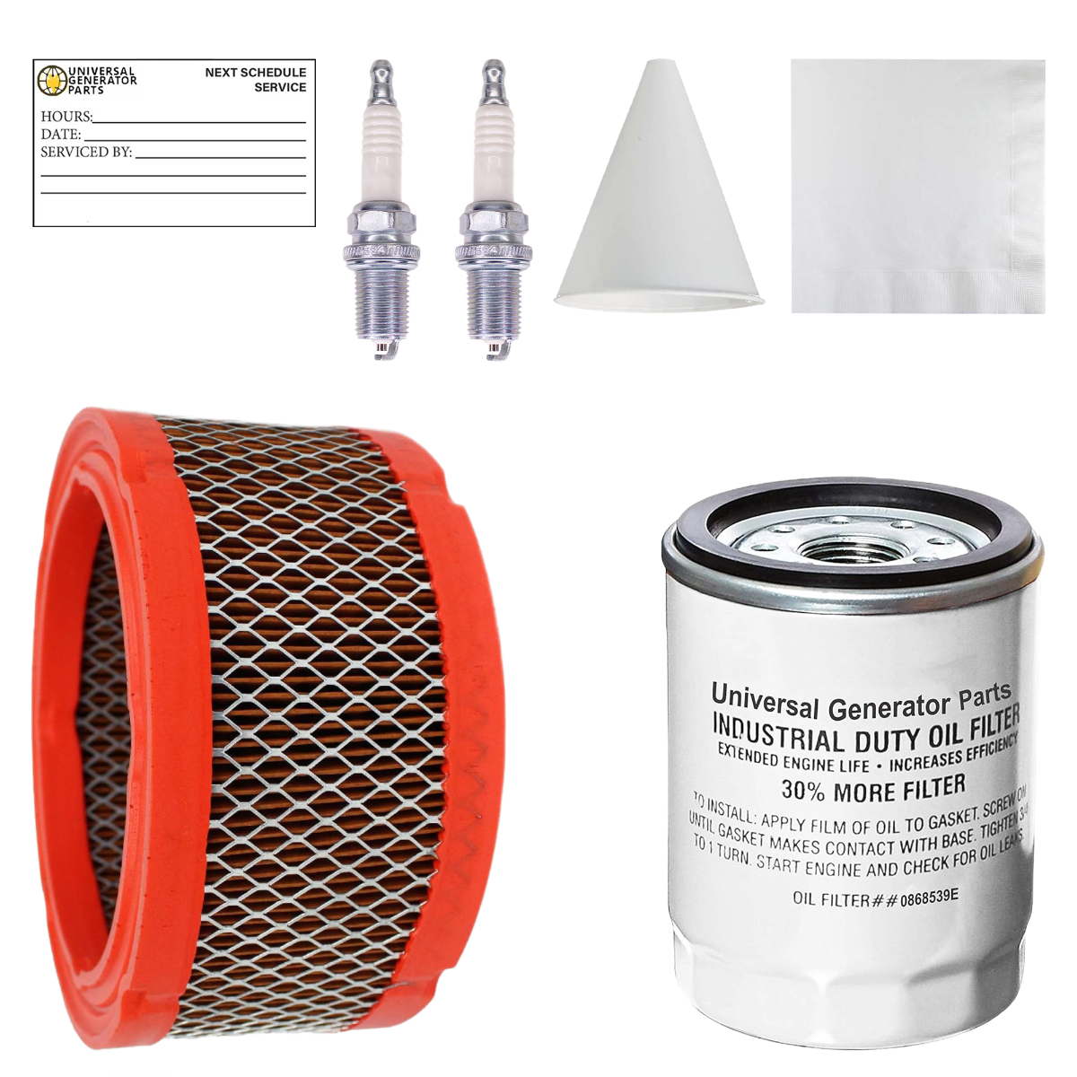 GENERATOR REPLACEMENT KIT: Keep your generator running smoothly with the universal generator part replacement kit. it includes an air filter, oil filter, funnel, paper, and plug for quick and easy replacements.
