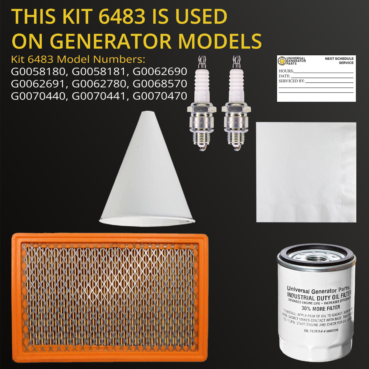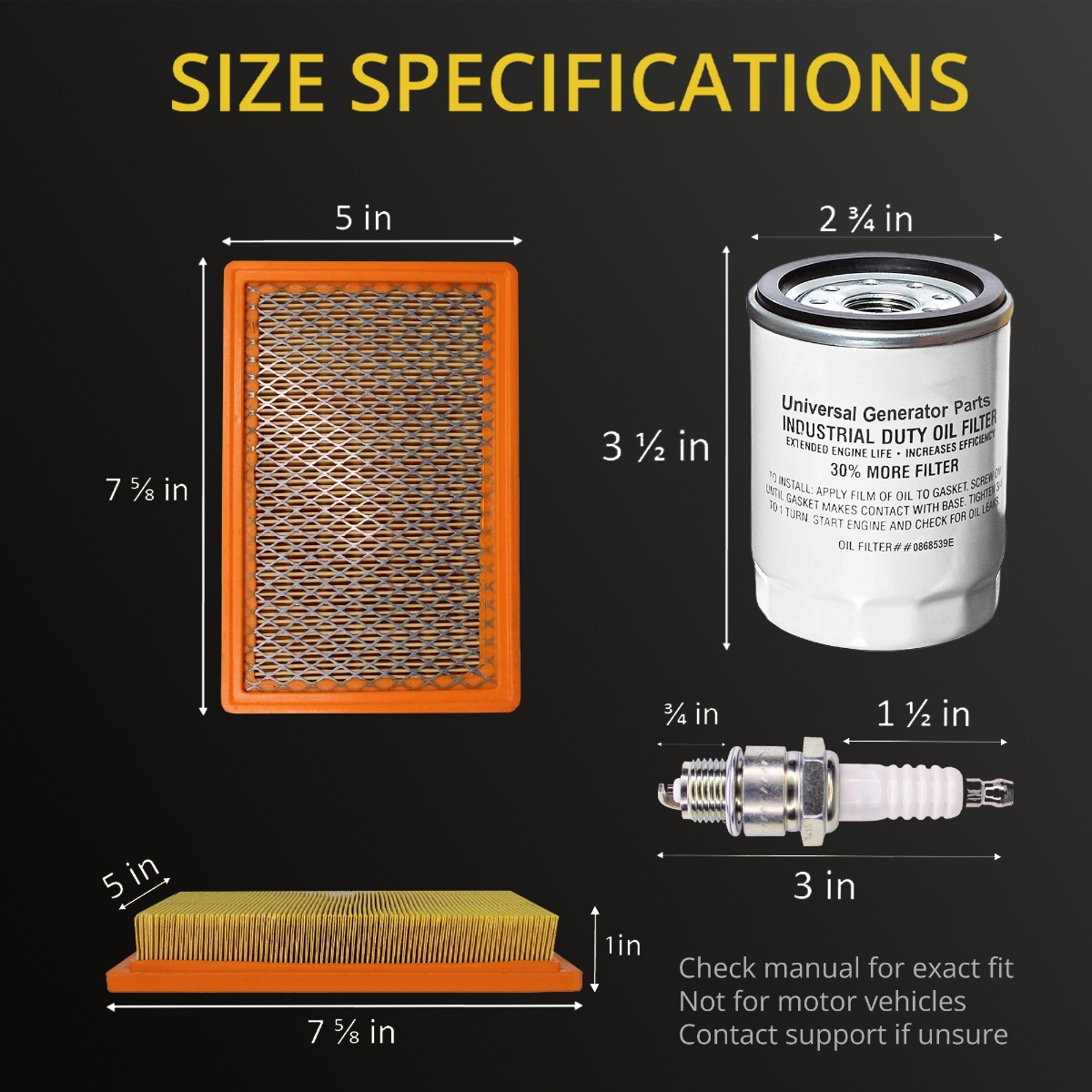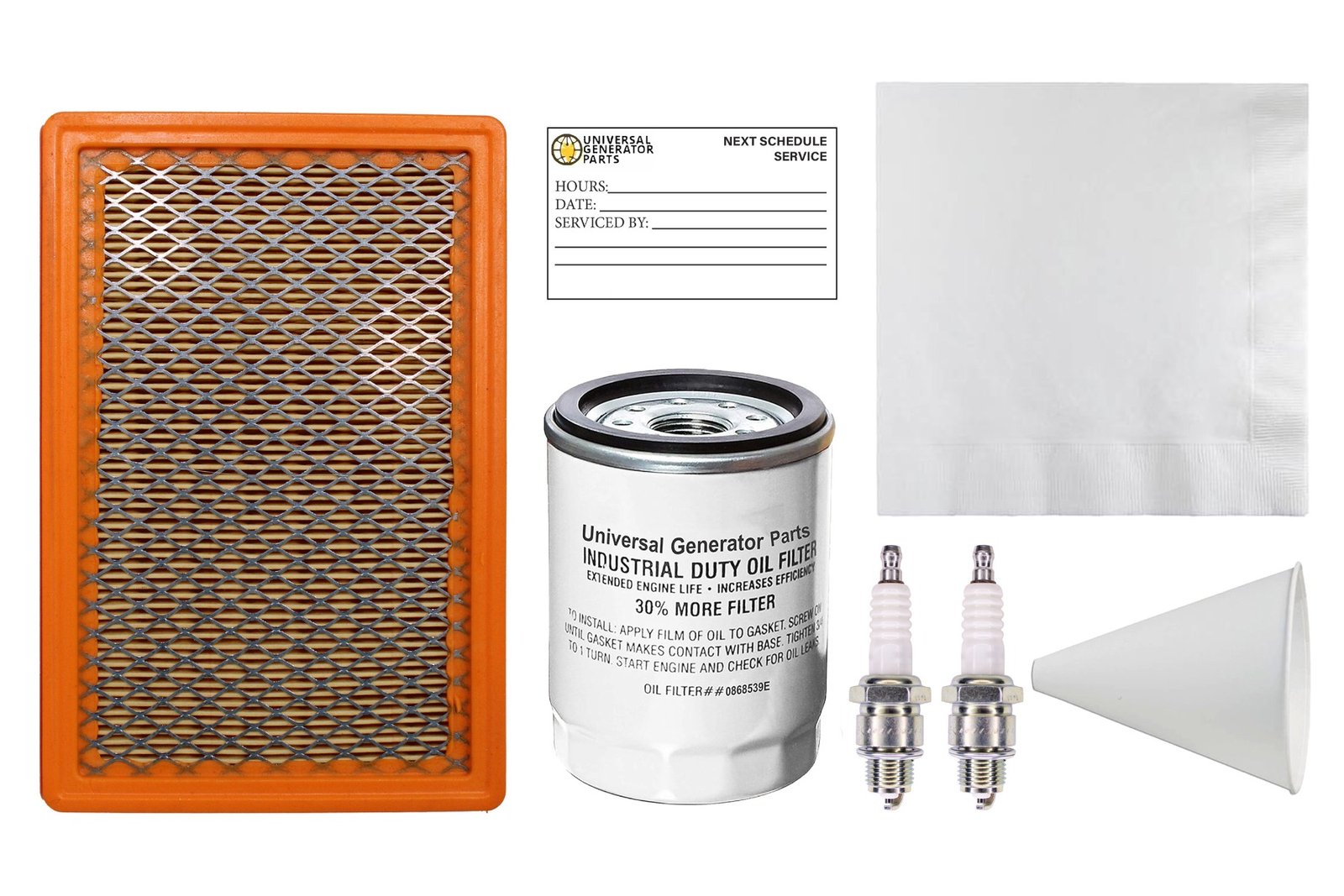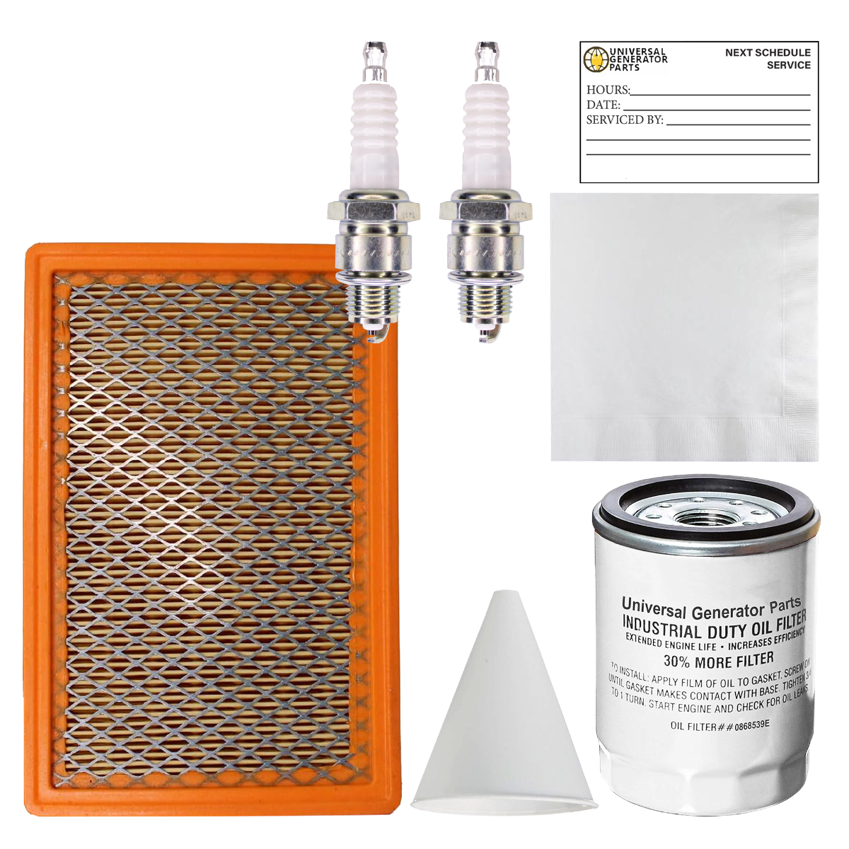 • UGP GENERATOR PARTS: This generator kit includes an air filter, oil filter, (2) spark plugs, oil wipe, paper funnel, and reminder sticker. These replacement parts ensure seamless compatibility with 533cc generators, delivering smooth operation.