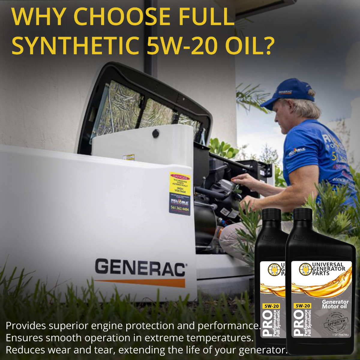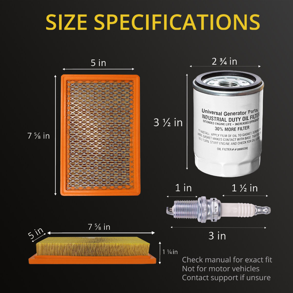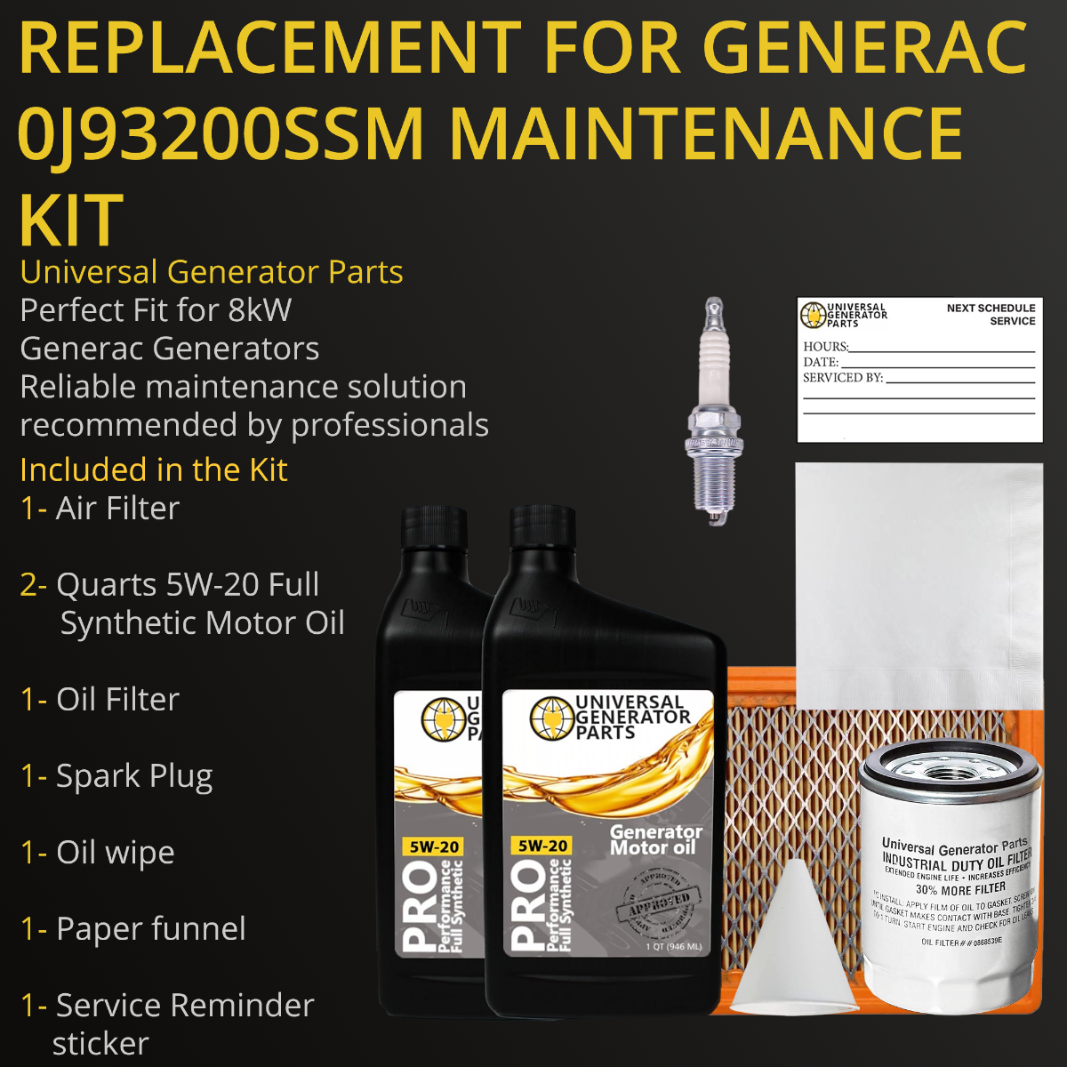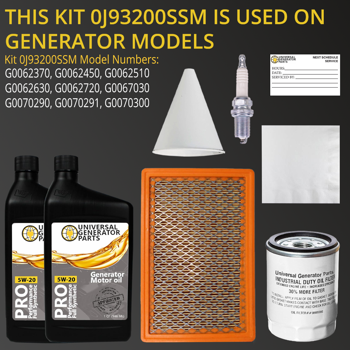 Universal Generator Parts replacement maintenance kit is designed for optimal performance in mind. This kit is designed to be a replacement kit for Generac 0J93230SSM and the new kit AA0002074712. This kit comes with 2- quarts of UGP 5W-20 full syntenic motor oil, 1- UGP oil filter, 1- Champion spark plugs, 1- paper funnel, 1- paper towel, 1- Universal Generator Parts replacement air filter for UGP 0E9371AS air filter, and 1-Universal Generator Parts reminder service sticker. Maintenance is recommended every 200-hours or 1-year and if your generator is running in a dusty environment a more frequent maintenance schedule may be required.
