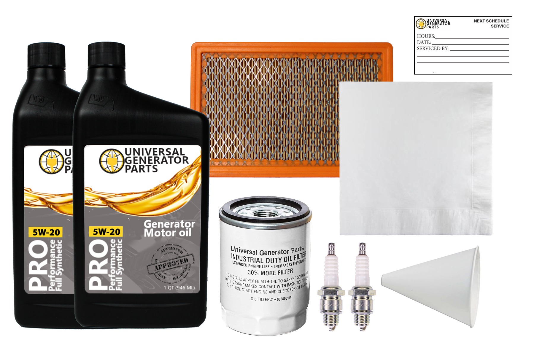 UGP REPLACEMENT KIT: The replacement parts 0J93210SSM for 6KW-11KW Evolution Standby Units includes (2) quarts of 5W-20 fully synthetic UGP oil, an oil filter, air filter, (2) spark plugs, funnel, and reminder card for easy and efficient servicing to ensure optimal performance.