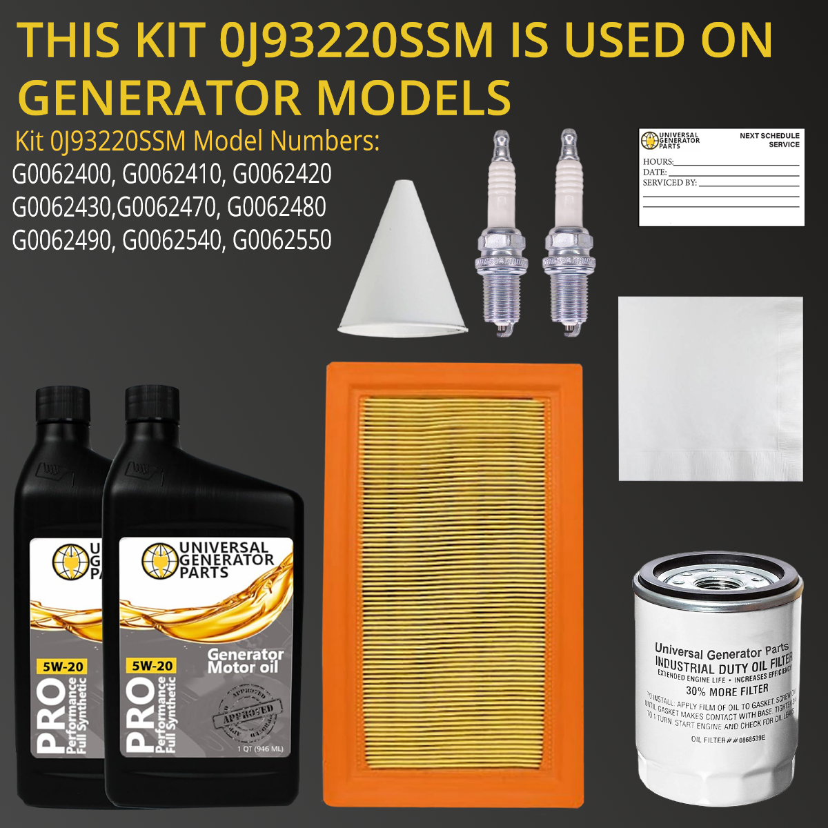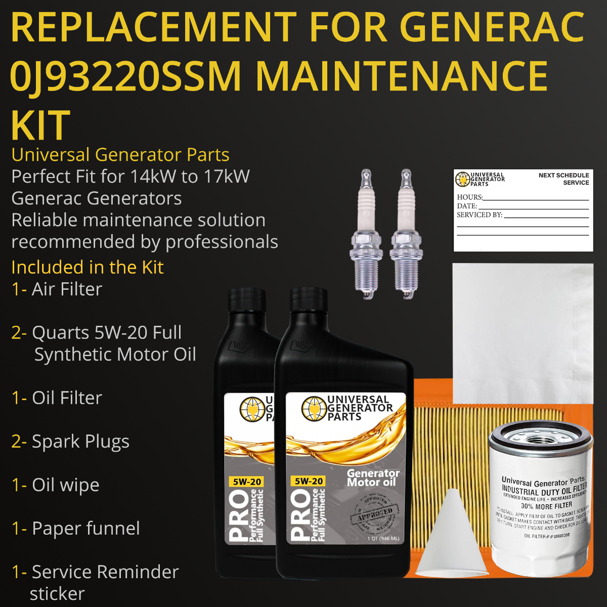 Universal Generator Parts replacement maintenance kit is designed for optimal performance in mind. This kit is designed to be a replacement kit for Generac 0J93220SSM and the new kit A0002074708. This kit comes with 2- quarts of UGP 5W-20 full syntenic motor oil, 1- UGP oil filter, 2- Champion spark plugs, 1- paper funnel, 1- paper nahd towel, 1- Universal Generator Parts replacement air filter for UGP 0J8478s air filter, and 1-Universal Generator Parts reminder service sticker. Maintenance is recommended every 200-hours or 1-year and if your generator is running in a dusty environment a more frequent maintenance schedule may be required.