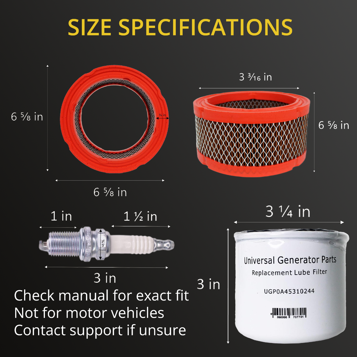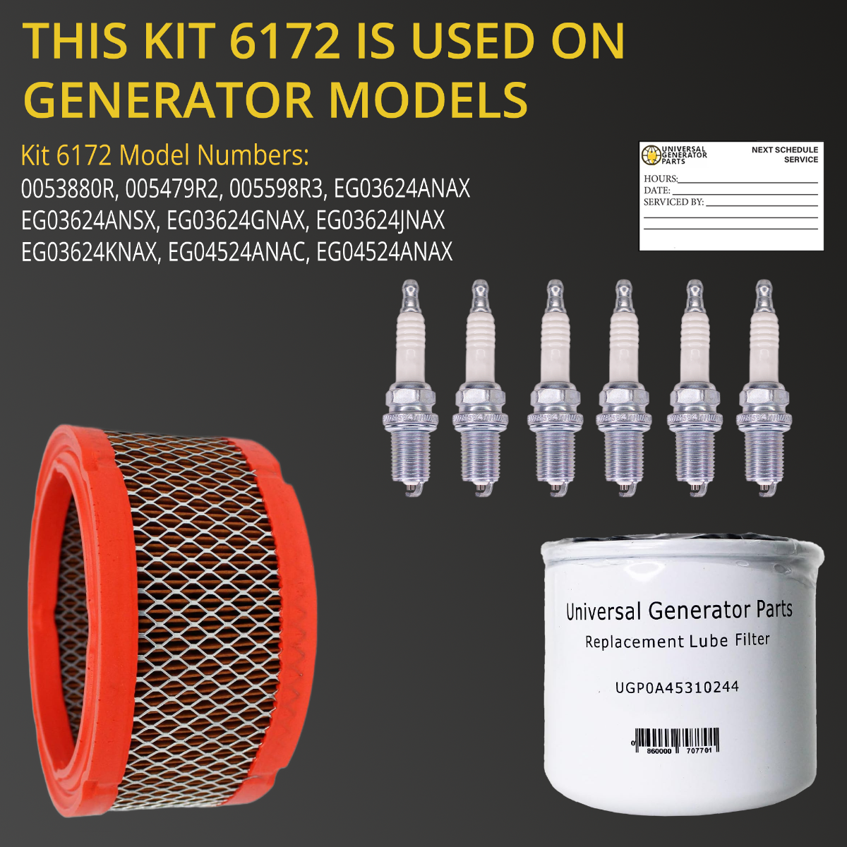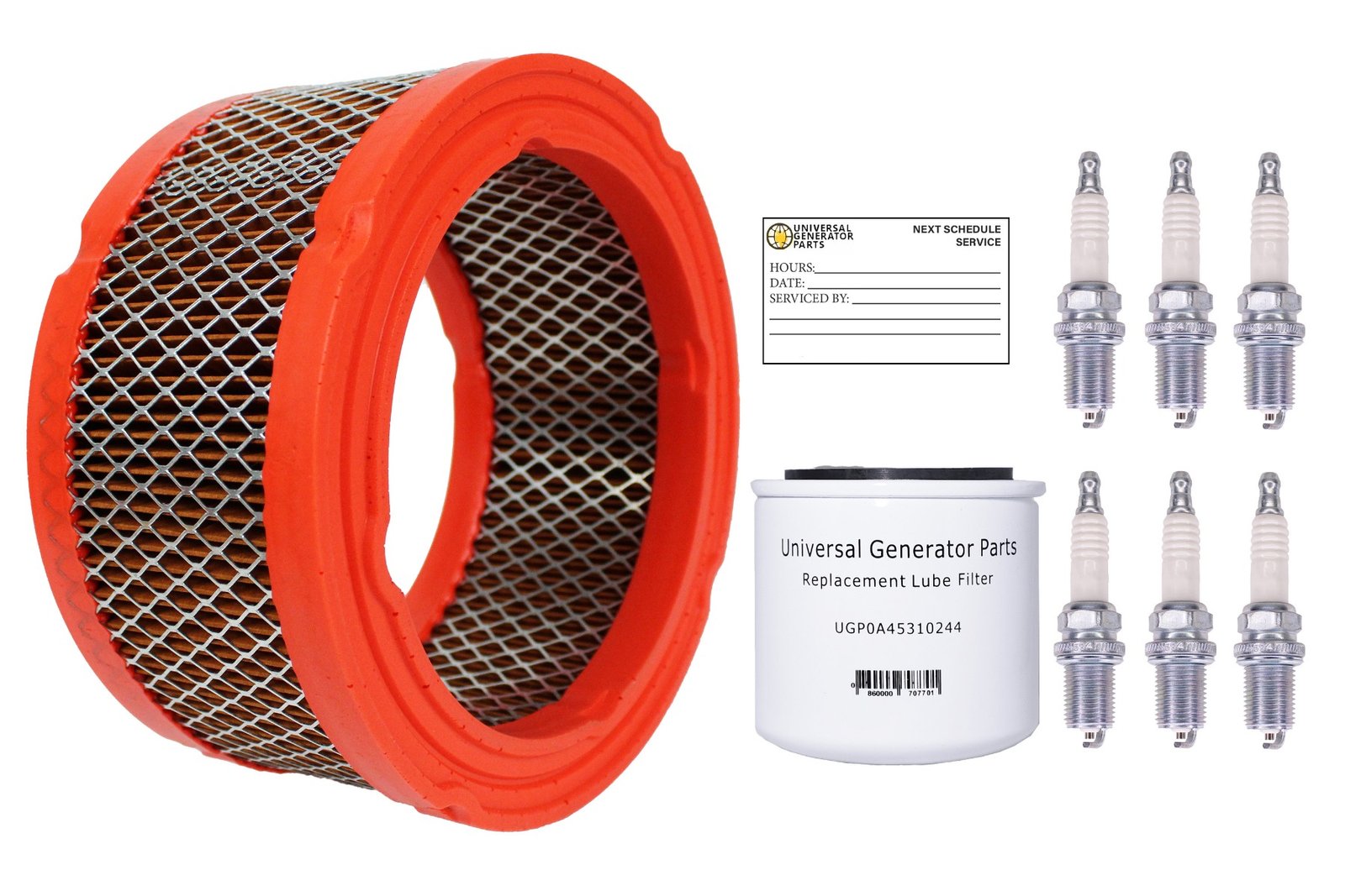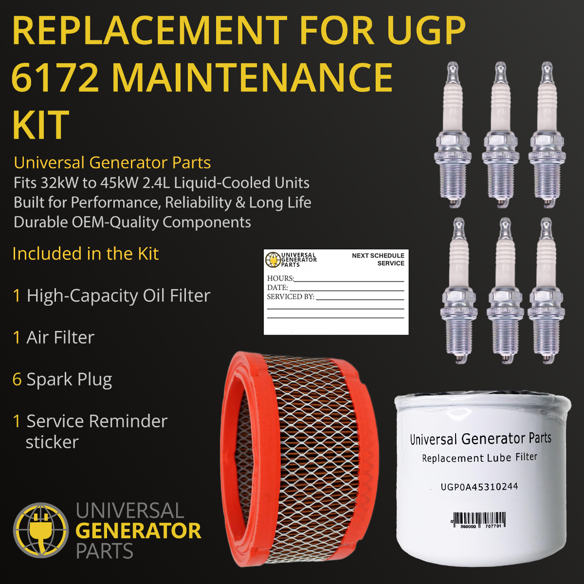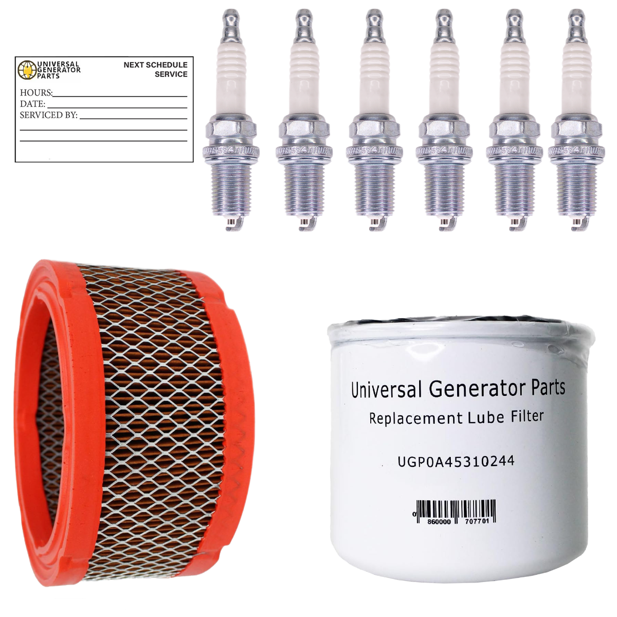• ESSENTIAL PARTS FOR GENERATOR CARE: The UPG kit includes everything necessary for performing a complete replacement on Generac 2.4l liquid-cooled generators, including air filter, oil filter, and (6) spark plugs. These components ensure that your generator maintains optimal performance for the long term.