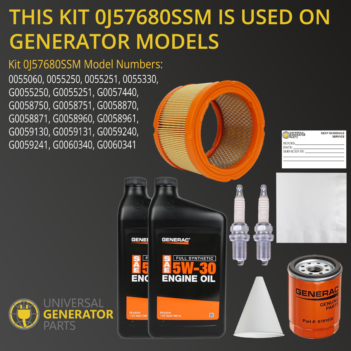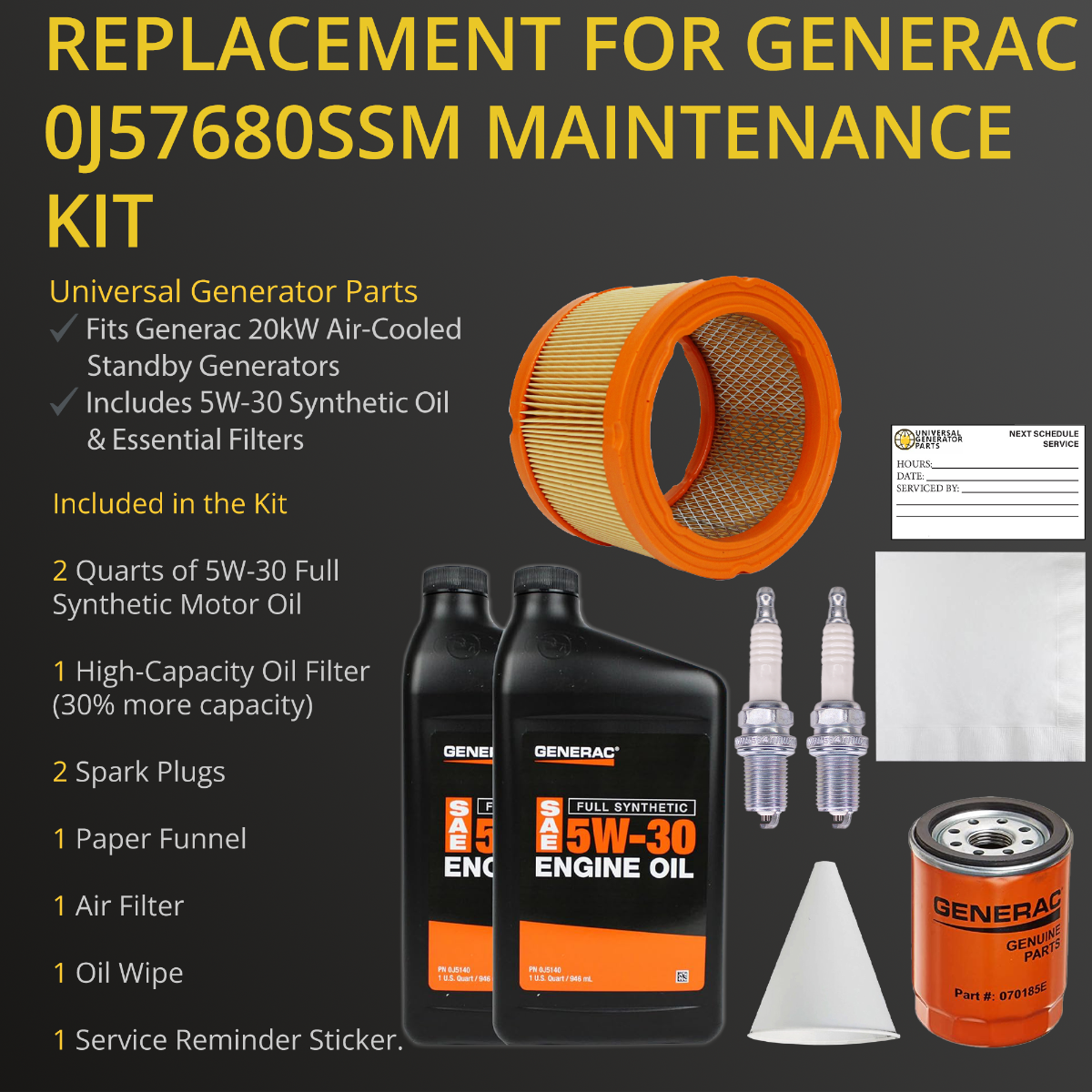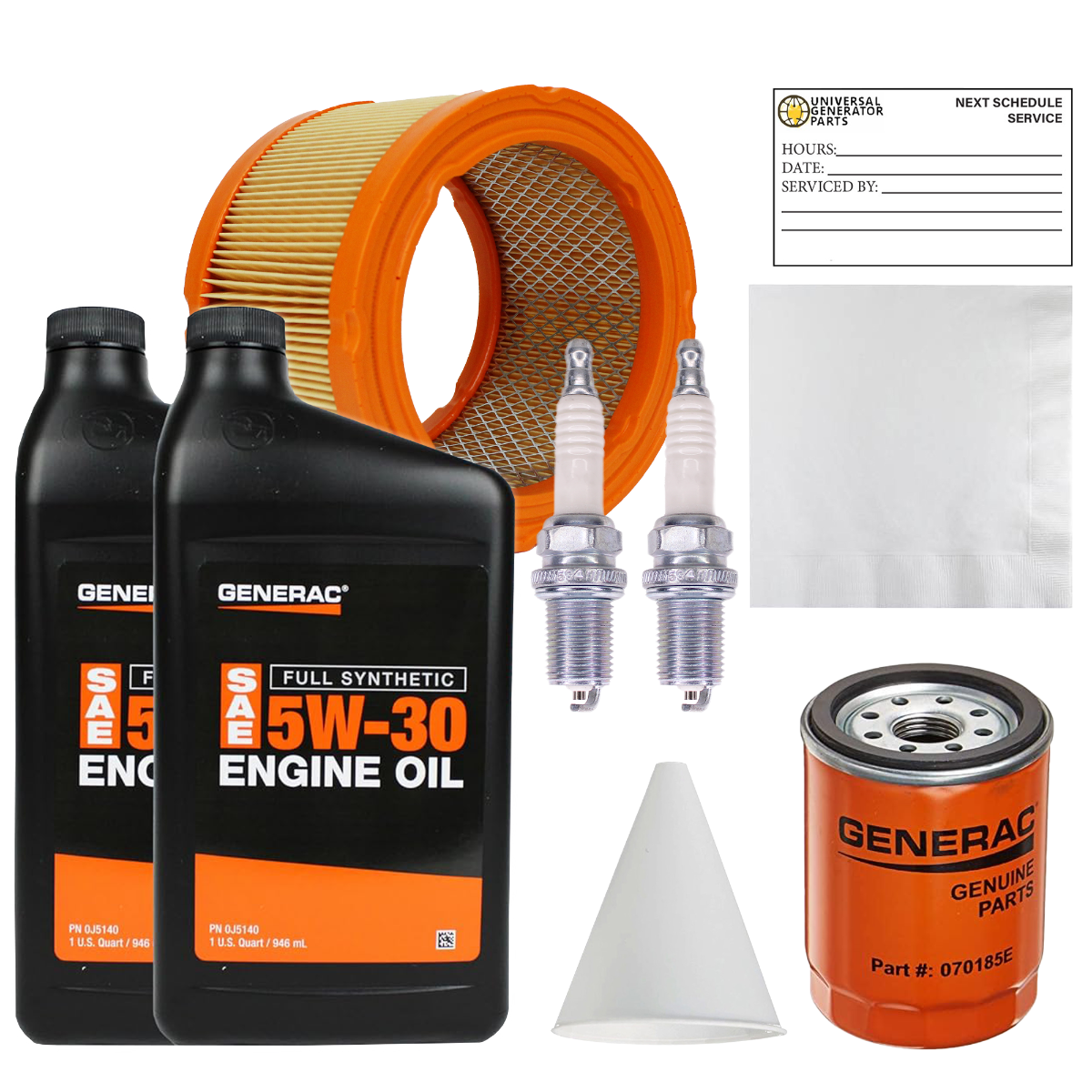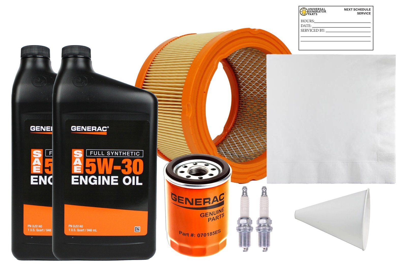• HIGH-QUALITY COMPONENTS: The Universal Generator Parts Maintenance Kit. It includes an air filter, oil filter, spark plug, oil wipes, a reminder sticker, synthetic oil, and a paper funnel, ensuring long-lasting reliability and optimal performance over time.