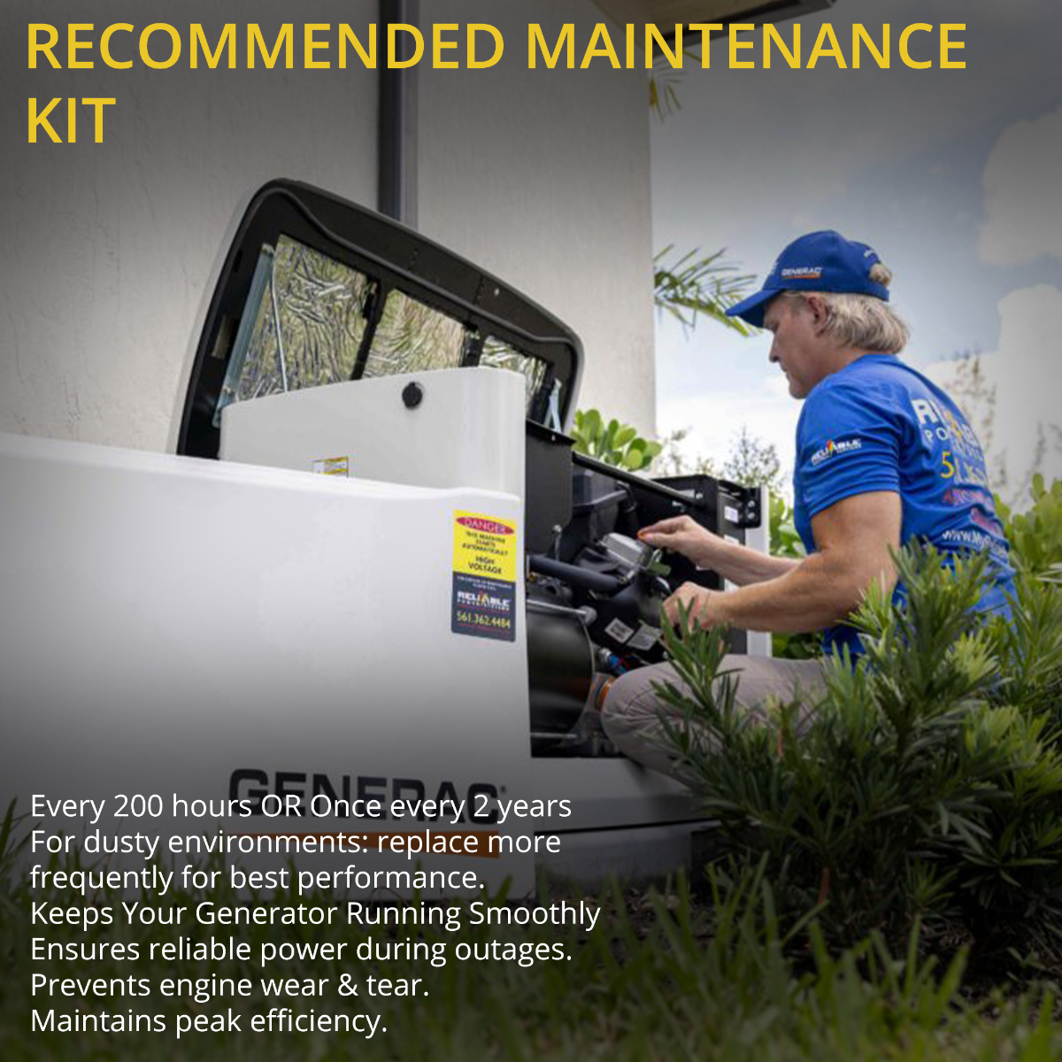 RECOMMENDED REPLACEMENT INTERVAL: A Regular replacement kit is advised every 200 hours or once every 2 years to maintain your generatorâs performance. If your generator operates in dusty environments, more frequent replacement may be necessary for top efficiency.